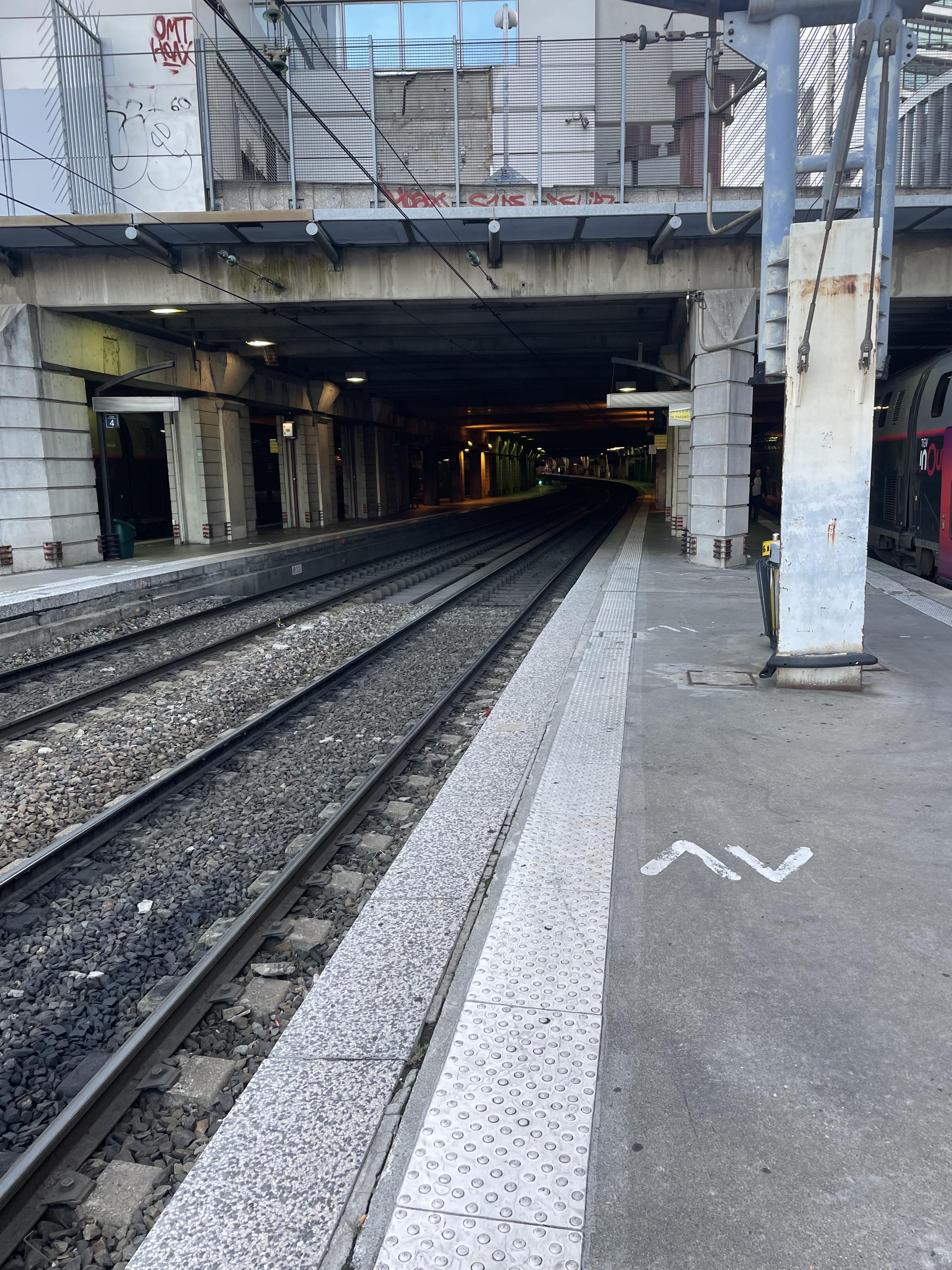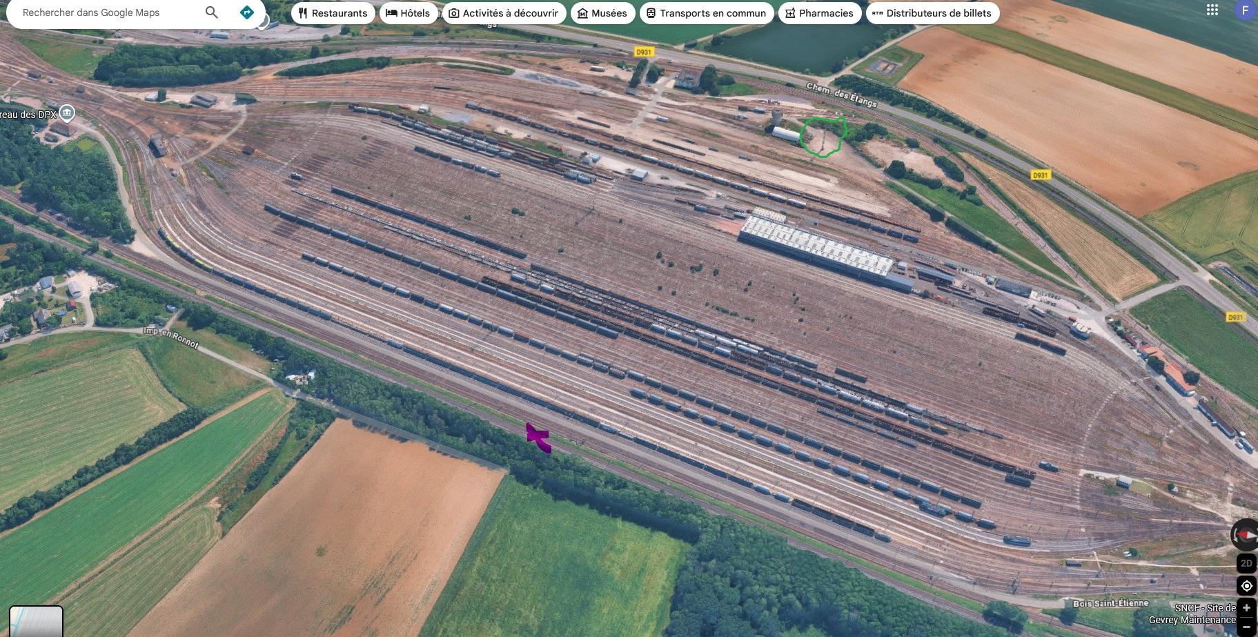 Tu longes le faisceau de tri et tu devais être un peu prêt là où j'ai mis la croix violette, en vert le pylône que l'on voit sur ta photo, là ou il y avait le dépôt. Tu circules sur les voies rapides, en bas les 2 voies de dessertes du triage partant du P3 de Perrigny et qui vont se raccorder au niveau du P.4 au PLM , puis le triage