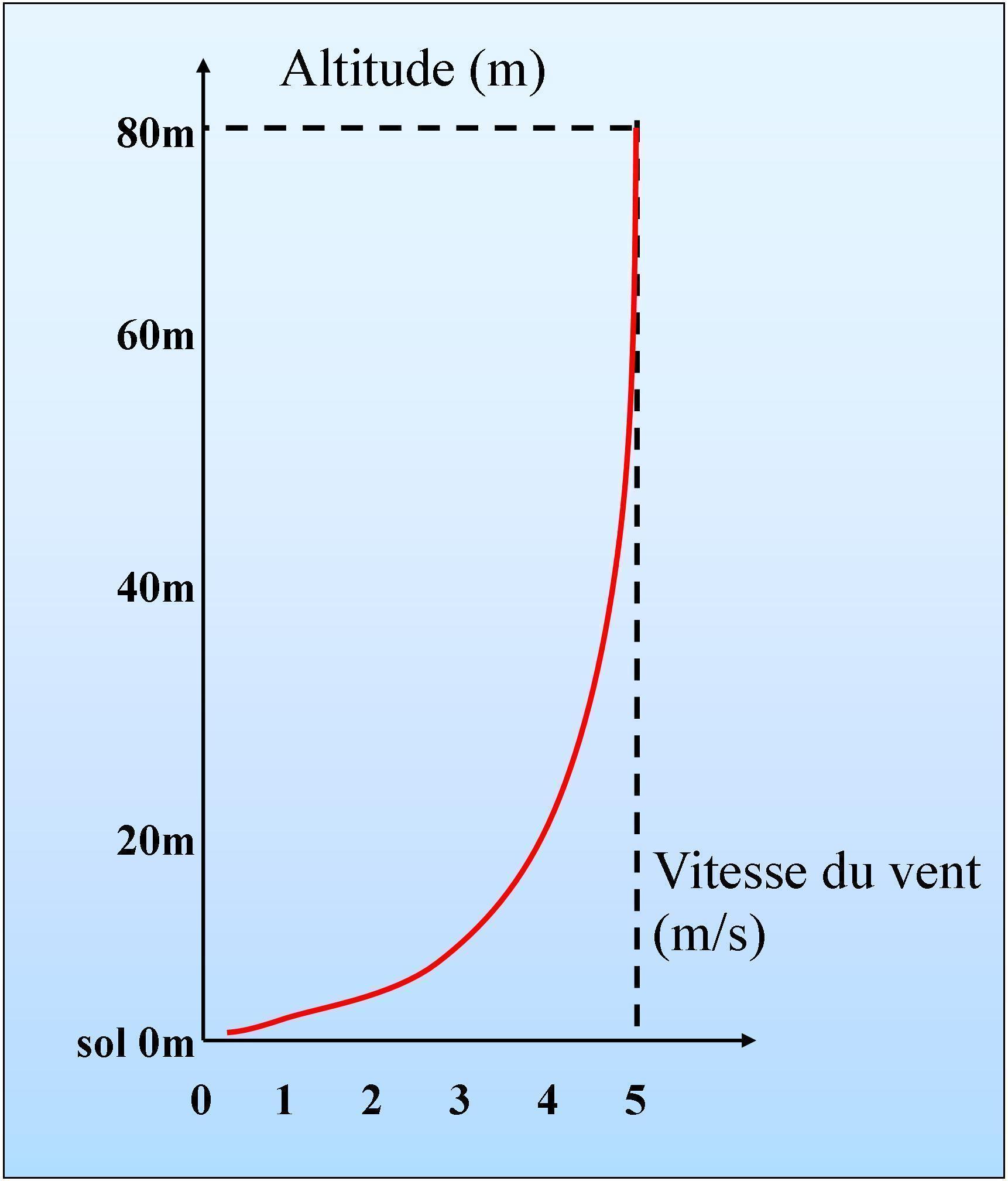 Ce schéma montre la différence de vitesse du ventre selon l'altitude en partant du sol. Plus le sol est "rugueux" (forêt, bâtiments...) plus la différence sera grande et plus il faudra implanter des machines hautes hauteur de mât = 1,2 fois le diamètre).