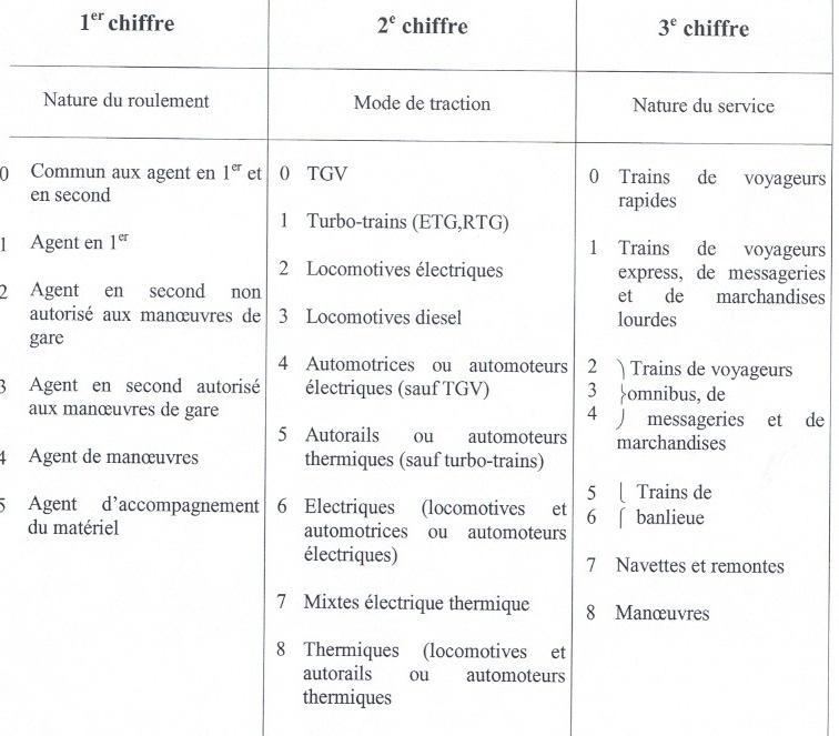Le 1er chiffre correspond à la nature du roulement, le 2ème au mode de traction, et le 3ème à la nature du service.